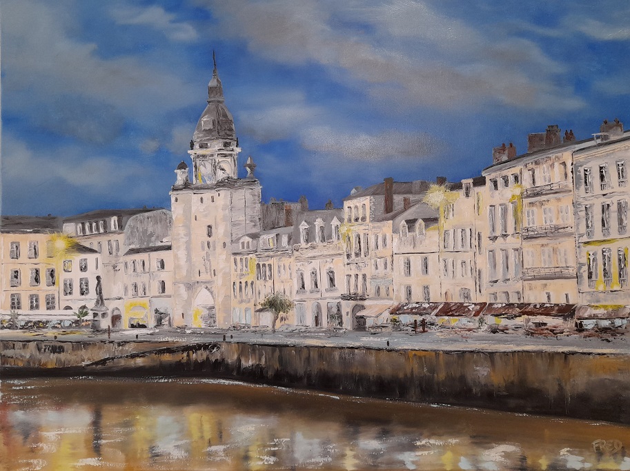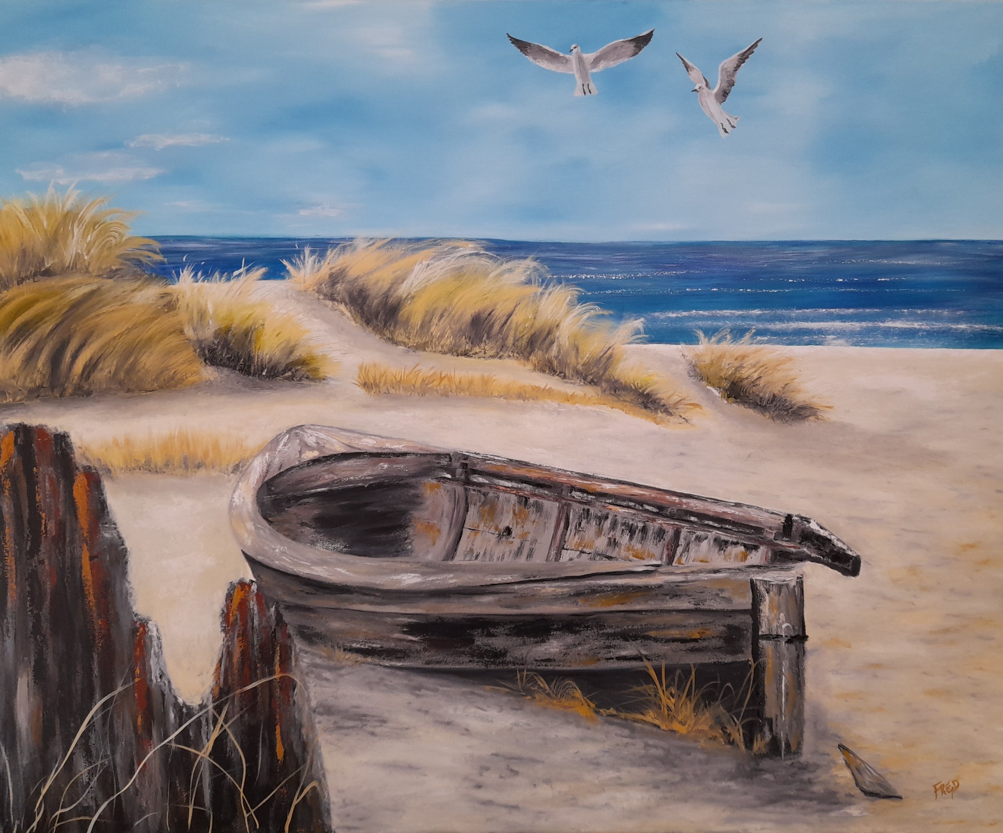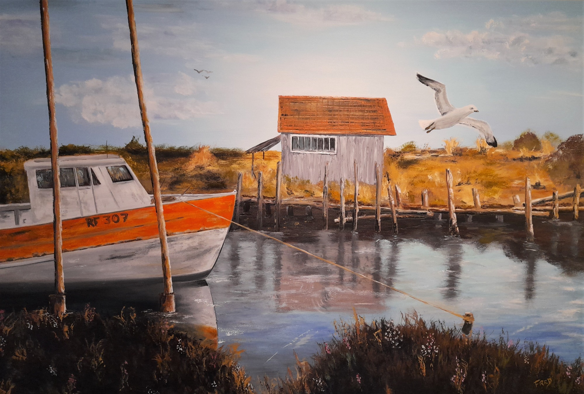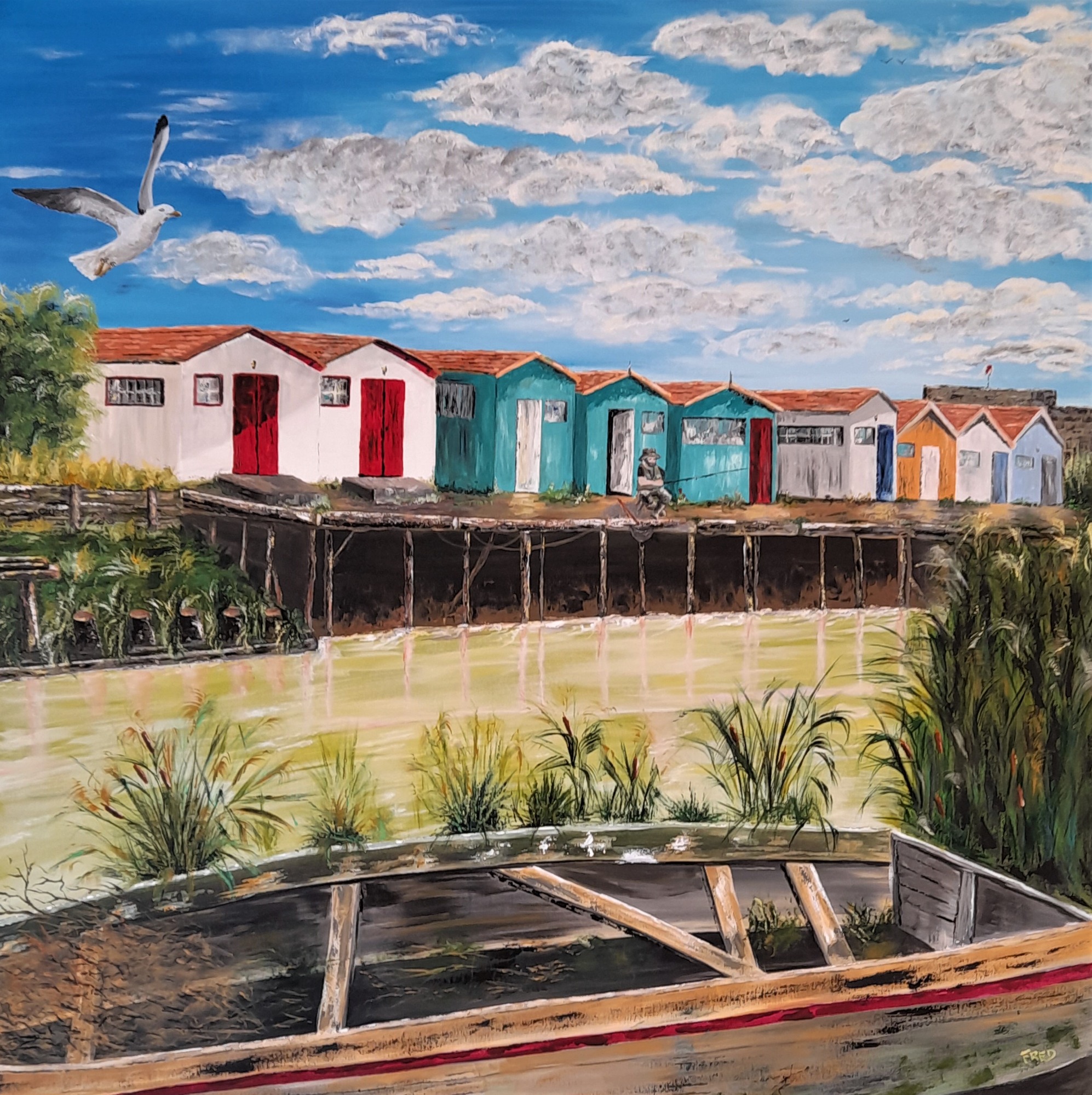 HUILE SUR TOILE - 60X80 CM UNE VIEILLE BARQUE ACCROCHEE A UN PONTON DANS LES MARAIS AU SOLEIL COUCHANT
