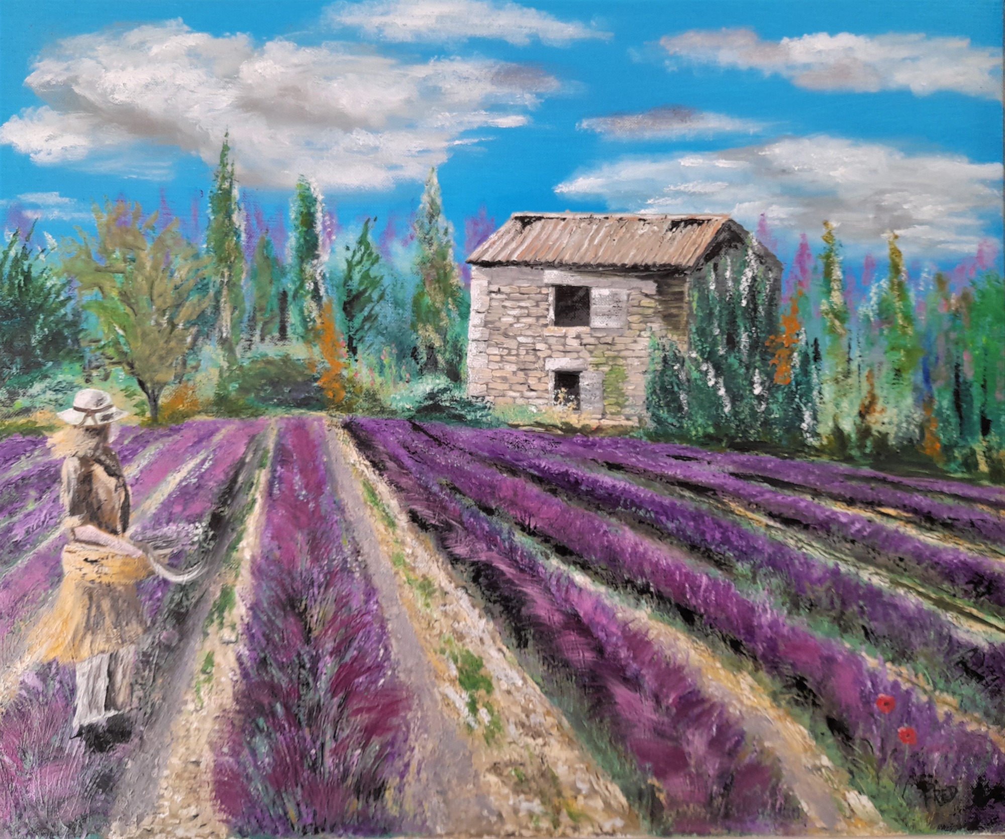 HUILE SUR TOILE - 60X50 CM UNE LAVANDIERE DANS SON CHAMP FLEURI OU DOMINE L ECLAT VIOLET MAUVE D UNE FLEURS ODORANTE